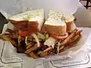Nationwide | Sliced cooked poultry, fried bacon, lettuce, tomato, and mayonnaise, often on toast |