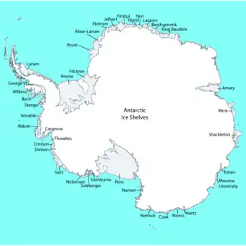 Ice shelves are attached to a large portion of the Antarctic coastline. Their total area is 1,541,700 km2.[1] Names are also listed in the Scientific Committee on Antarctic Research, Gazetteer.[2] The ice shelf areas are listed below, clockwise, starting in the west of East Antarctica: