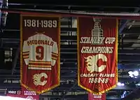 Calgary played its first season in the Patrick Division before moving to the Smythe when the NHL realigned along geographic lines in 1981.[3] The Flames qualified for the playoffs each year from their arrival in 1980 until 1991.[4] During that time, they won two Presidents' Trophies as the NHL's top regular season club, 1987–88 and 1988–89,[5] captured the Clarence S. Campbell Bowl as Campbell Conference champions twice, 1985–86 and 1988–89, and won the Stanley Cup in 1989.[1] The Flames fared poorly following their Cup win, failing to win another playoff series until 2004, a span of 15 seasons, during which they missed the playoffs eight times.[4] The team returned to the post-season in 2004, making an unlikely trip to the Finals, during which the team captured its third Clarence Campbell Bowl by winning the Western Conference championship by becoming the first team in NHL history to defeat three division winners.[6] Overall, the Flames have made 25 appearances in the Stanley Cup playoffs.[4]