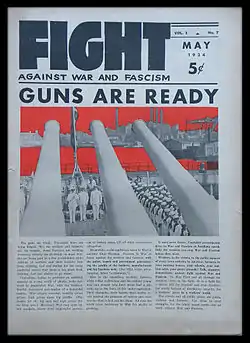 • FIGHT against War and Fascism was the monthly newsmagazine of the American League Against War and Fascism, chaired by J.B. Matthews. The large format 10 x 14 publication was printed on newsprint and saddle-stitched, with a cover price of just 5 cents per copy. The editorial office of FIGHT was located at 104 Fifth Avenue in New York City. Contributors to the first issue included Henri Barbusse, John Strachey, Fenner Brockway of the British Independent Labour Party, Roger Baldwin of the American Civil Liberties Union. and artist William Gropper. The publication was launched in November 1933 and ran until December 1937, at which time the publication's name was changed in accordance with the CPUSA's Popular Front line. FIGHT is available on microfilm with the master negative held by the New York Public Library.[19]