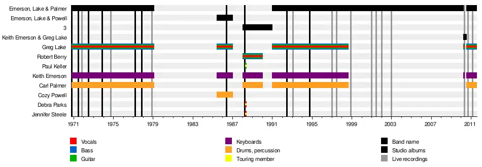 Emerson, Lake & Palmer were an English progressive rock supergroup formed in London in April 1970.[1][2] The band consisted of Keith Emerson (keyboards), Greg Lake (vocals, bass, guitar and producer) and Carl Palmer (drums and percussion). The band originally ran from 1970 till 1979, and reformed several times after with differing personnel and names. Including "Emerson, Lake & Powell" with Cozy Powell (drums and percussion), in 1985, and "3" with Robert Berry (vocals, bass and guitar), in 1988, before finally reverting to the original line up in 1991 until 1998 and finally in 2010 before Emerson and Lake died in 2016.[3][4]