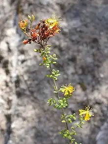 Almost all species of Hypericum are either perennial herbs, shrubs, or small trees, but the genus also contains a small amount of subshrubs and annual herbs.[3] Most of its species contain hypericin or hyperforin and some are used for their healing properties in folk medicine. The species' leaves are always placed opposite, and are normally decussate.[5] Their flowers are generally homostylous, but very few are dimorphically heterostylous. The petals are normally golden yellow or orange, but some are white or cream, and are veined dorsally. They have 4-5 stamen fascicles, 2-5 ovaries, and 2-5 styles. Some species grow capsular fruit which are colored red or blackish.[6]