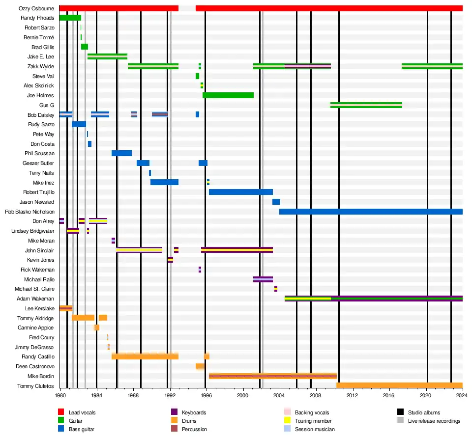 Ozzy Osbourne is an English heavy metal vocalist from Marston Green, Warwickshire. After he was fired from Black Sabbath earlier in the year, Osbourne formed a solo band (initially known as Blizzard of Ozz) in November 1979 with guitarist Randy Rhoads, bassist Bob Daisley and drummer Lee Kerslake. Since their inception, the group's personnel have changed regularly. The current lineup includes guitarist Zakk Wylde (who first joined in 1987 until 1992, spent a second tenure in the band from 2001 and 2009, and most recently rejoined in 2017), bassist Rob "Blasko" Nicholson (a member since 2003), keyboardist and rhythm guitarist Adam Wakeman (who first joined as a touring musician in 2004, and was made an official member with the release of Scream in 2010), and drummer Tommy Clufetos (since 2010).