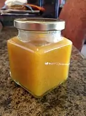 An edible thickening agent used to make jellies, flan, or desserts derived from dried seaweed. | ||