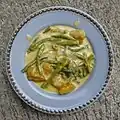 Usually dried tofu or tokwa. Sometimes added as an optional ingredient in some vegetable dishes. Silken tofu is usually associated with the snack or dessert taho (see above) which sees it mixed with a sweet syrup. | ||