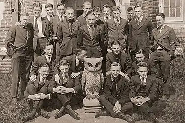 Reed students posing with the college's unofficial mascot, the Doyle Owl