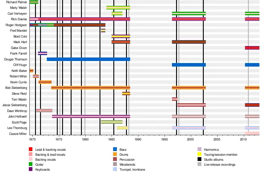 Davies and Hodgson rebuilt Supertramp in 1973, bringing in new members Dougie Thomson on bass, Bob Siebenberg on drums and John Helliwell on saxophone and woodwind instruments, who together released the band's "breakthrough" album Crime of the Century in 1974.[3] This lineup remained stable for a total of ten years, until Hodgson left in 1983 following a period of "musical differences" with the rest of the group, mainly Davies.[4] The group continued as a four-piece with touring musicians following Hodgson's departure, releasing the less successful Brother Where You Bound in 1985 and Free as a Bird in 1987, before breaking up the following year.[5]