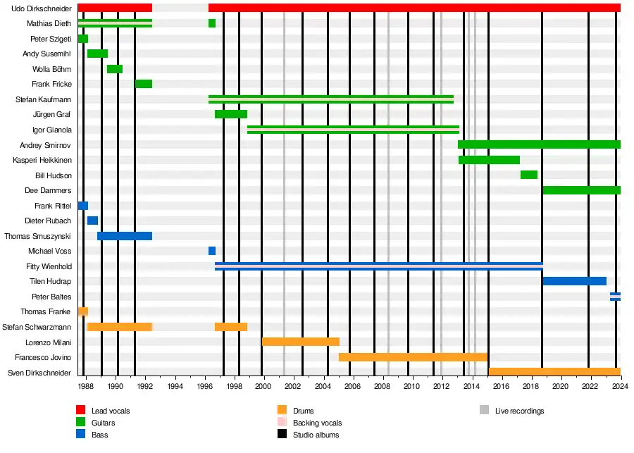 Bill Hudson took over from Heikkinen in March 2017,[14] but by the following April had left due to musical differences.[15] The band were temporarily rejoined by Kaufmann for a string of summer festival appearances.[16] Shortly after the release of Steelfactory, long-time bassist Fitty Wienhold announced his departure from U.D.O., but assured fans that he would continue to offer his support in the form of songwriting if requested.[17] The following month, the band announced the additions of guitarist Dee Dammers in place of Hudson, and bassist Tilen Hudrap in place of Wienhold.[18] In September 2022 Hudrap was replaced by former Accept bassist Peter Baltes, first on a temporary bassist until April 2023 when Baltes officially replaced him.[19]