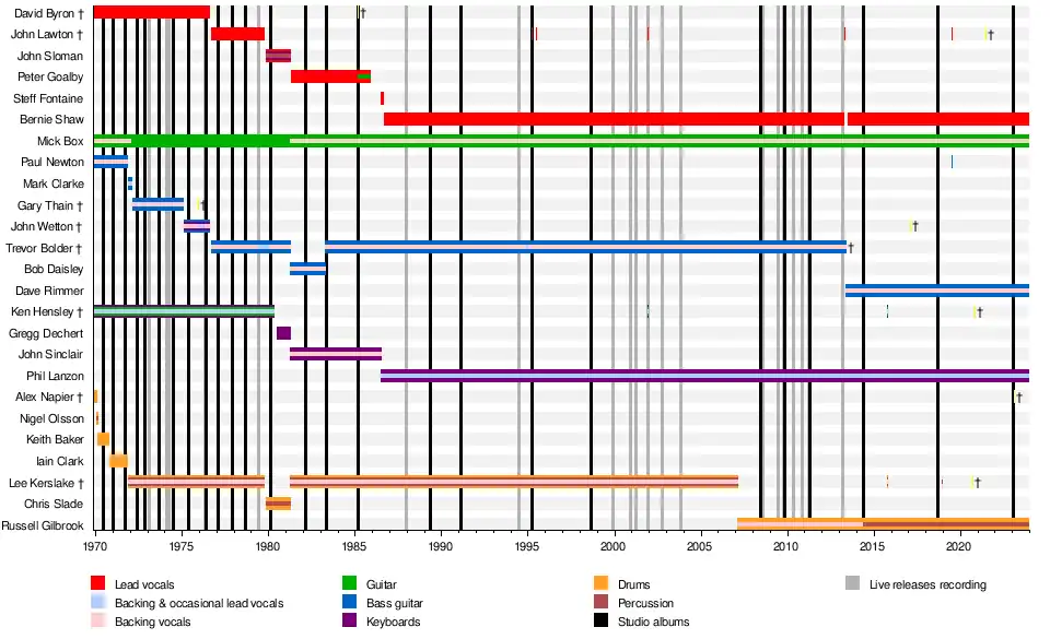 | Ken Hensley | 1969–1980 (plus live guest in 2001 and 2015[24]) (died 2020)[1][7][8][25] |