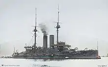 Asahi was a slightly improved version of the British Formidable-class battleships.[34] She became the flagship of the IJN's Standing Fleet and was later assigned to the 1st Fleet when the Combined Fleet reformed in 1903.[41][42] At the start of the Russo–Japanese War, Asahi took part in the Battle of Port Arthur and was not damaged by Russian fire. At the Battle of the Yellow Sea, the ship was moderately damaged, although she hit and damaged Poltava and Tsesarevich in return.[43] Asahi struck a mine two months later near Port Arthur, but was repaired in time for the Battle of Tsushima. There, she helped disable the battleship Knyaz Suvorov and dueled with the battleships Borodino and Oryol, taking no damage.[44]
