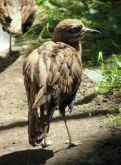Bustards are large terrestrial birds mainly associated with dry open country and steppes in the Old World. They are omnivorous and nest on the ground. They walk steadily on strong legs and big toes, pecking for food as they go. They have long broad wings with "fingered" wingtips and striking patterns in flight. Many have interesting mating displays.