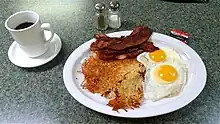 This is a list of brunch foods and dishes. Brunch is a combination of breakfast and lunch eaten usually during the late morning but it can extend to as late as 2 pm and 8 pm on the East Coast, although some restaurants may extend the hours to a later time.[1][2] The word is a portmanteau of breakfast and lunch.[3] Brunch originated in England in the late 1800s, served in a buffet style manner, and became popular in the United States in the 1930s.[4]