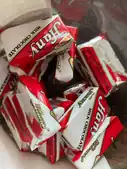 This has a soft, chewy texture, and is formed into cylinders approximately 3 cm long and 1 cm in diameter, similar to contemporary western nougat or taffy. Each candy is wrapped in a printed waxed paper wrapper, but within this, the sticky candies are again wrapped in a thin edible paper-like wrapping made from sticky rice.[6] Although the rice wrapping layer is meant to be eaten along with the rest of the candy, it does not figure in the list of ingredients, which is limited to corn starch, syrup, cane sugar, butter, and milk. This also comes in a variety of flavors. |