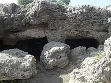 Kai Caves are situated at ancient Kai valley[5] in Sindh, Pakistan. The Kai valley is towards the south of Sehwan Sharif, Jamshoro District in Kirthar Mountains Range. Here, there are two sites of Kai Caves. One is upper which is towards the east at a high hill and second is towards the west at a lower hill. The lower caves are called "Satt Ghariyoon" (Seven Caves).[6][7] Nearby the upper caves, the top of the hill is surrounded by very ancient compound wall which is constructed with stones. The remains of ancient settlement and very old potsherds have been explored. The discovered earthenware or ceramic material refers to earlier Indus Valley civilisation while the period of caves has been considered as the Stone Age.[8] |