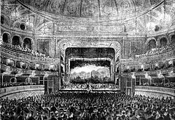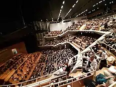 A concert hall is a cultural building with a stage that serves as a performance venue and an auditorium filled with seats.