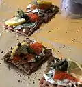 Czech Republic, Slovakia | A Czech and Slovak appetizer or snack, it consists of an open-faced sandwich topped with butter and a variety of other toppings, such as cured meats, fish, hard-boiled egg, and vegetables. |