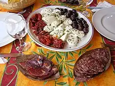 Argentina | A serving of savory snack and finger foods, including cheeses, cured meats, fermented sausages, olives and peanuts.[27][28] |