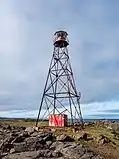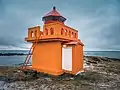 | Kópanesviti | L4567 | Vestfirðir | 1971 | 25 m (82 ft) | 7 m (23 ft) | Orange rectangular structure, white lantern house on roof. | Active | ![]() |