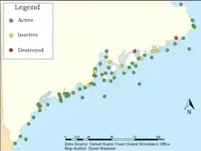 This is a list of all lighthouses in the U.S. state of Maine as identified by the United States Coast Guard.[1] There are fifty-seven active lights in the state, two of which are maintained as private aids; nine are standing but inactive, and three have been destroyed, one of which has been replaced by a skeleton tower. This includes two stations which originally featured twin towers; in both cases both towers survive but only one of each pair is active.