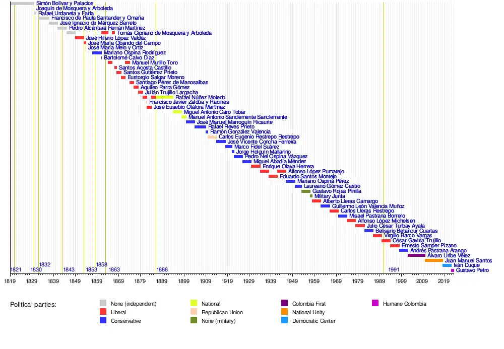 This list includes those persons who were sworn into or forcibly took the office of president of the Republic of Colombia following the passing of the Colombian Constitution of 1832, which took effect on 30 August 1821.