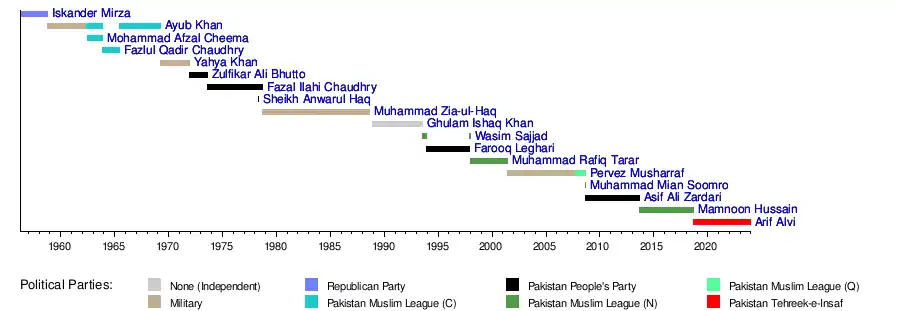 There have been a total of 13 presidents. The first president was Iskander Ali Mirza who entered office on 23 March 1956. The current office holder is Muhammad Sadiq Sanjrani, who took charge on 9 September 2023, following his victory in the 2023 elections.[1]