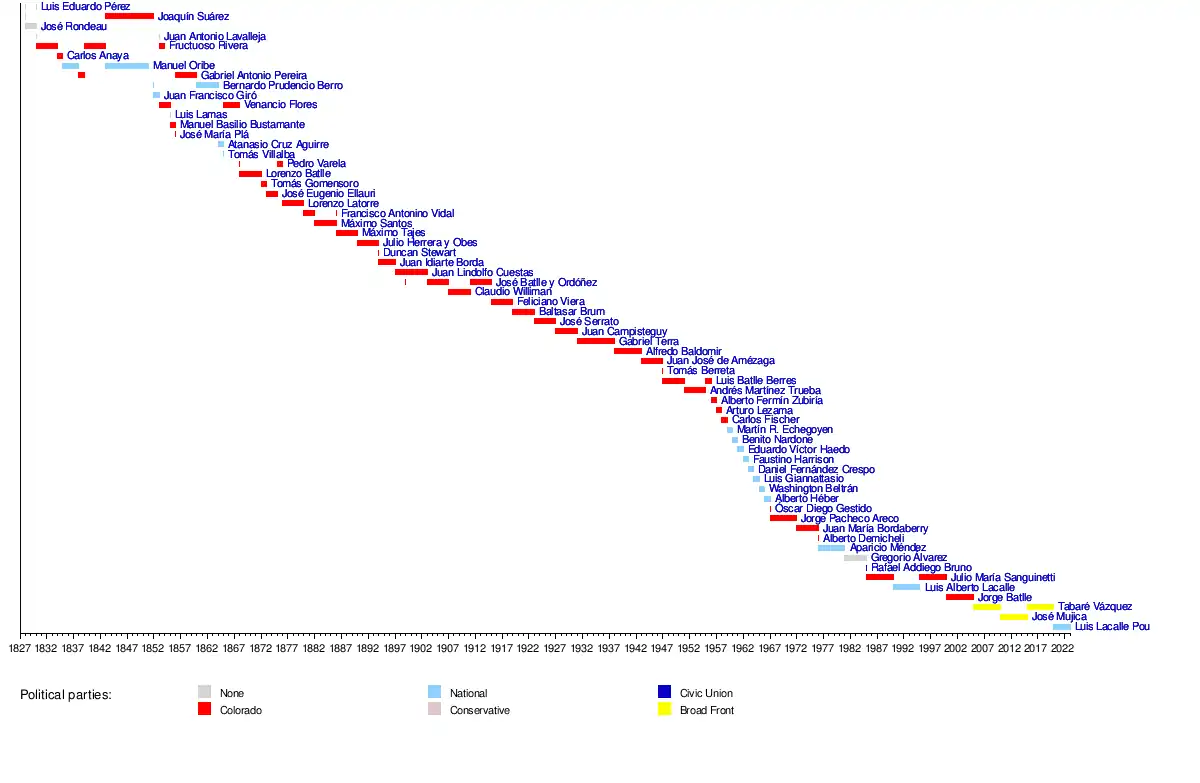 1 March 2015 | 1 March 2020 | Broad Front | 2014 | 41st Constitutional President, elected by the citizens.[3] | Raúl Sendic Rodríguez | |