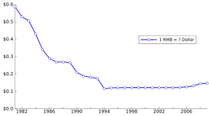 - ↑ Exchange rates of 1981-1984: see "17-2 Average Exchange Rate of RMB Yuan against Main Convertible Currencies (Middle Rate)" China Statistical Yearbook 2001; exchange rates of 1985-2014: see China Statistical Yearbook 2015 / Financial Intermediation / 19-8 Reference Exchange Rate of Renminbi (Period Average); exchange rate of 2015: see Statistical Communiqué of the People's Republic of China on the 2015 National Economic and Social Development