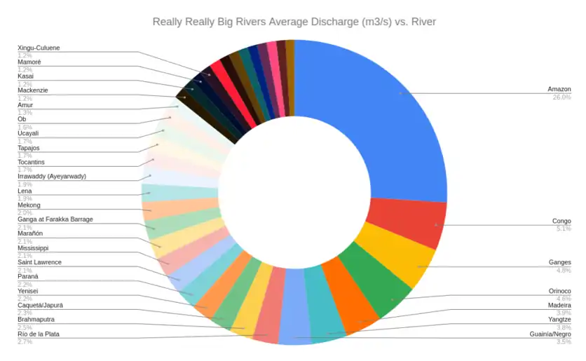 For context, the volume of an Olympic-size swimming pool is 2,500 m3. The average flow rate at the mouth of the Amazon is sufficient to fill more than 83 such pools each second. The combined flow of all the rivers in this list adds up to 1,192,134 m3/s.