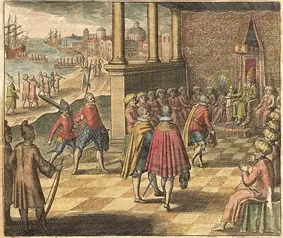 The title of Sultan was first claimed by the former Kolano (King) of Tidore, Ciri Leliatu known later as Sultan Jamaluddin. According to the Malay chronicle of Hikayat Ternate, Ciri Leliatu was the son of Matagena, a Malay lord who expelled his predecessor Kolano Sele and acquired kingship over the island.[26] According to even later sources, he was descended from a line of Muslim qadis and thus started a new royal lineage, and eventually died in Gotowasi village in Halmahera.[27] He is nevertheless counted among the pre-Islamic rulers. Matagena's son was Ciri Leliatu, also called Ciriliyati, who succeeded to the Kolano-ship in the late 15th century. An Arab called Syekh Mansur came to Tidore and converted him to Islam, whereby he received the Islamic name Sultan Jamaluddin. The eldest son of the king was named after the preacher, and later succeeded his father as Sultan al-Mansur.[28] Al-Mansur was, according to later historical tradition, the son of the first Muslim ruler of Tidore, Ciri Leliatu. He was named after Syekh Mansur, an Arab who persuaded his father to convert to Islam.[29] As he later told Spanish visitors, his father had been killed during a journey to Buru Island, which was normally a dependency of the rivalling Sultanate of Ternate.[30] According to European sources, Islam was accepted by the North Malukan elite in about the 1460s-1470s. Ciri Leliatu's son Sultan al-Mansur ruled when the Portuguese first visited Maluku in 1512, and met the remnants of the Magellan expedition in 1521.[31]