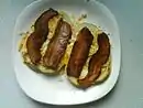 United States | Open-faced grilled cheese sandwich with bacon. |