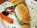 United States | Generic sandwich served on a long French or Italian roll which may contain a wide variety of sliced meats, vegetables, and condiments, including lettuce, tomato, sweet peppers, onions, olives, and mushrooms. Also known regionally as a hero, a hoagie, a grinder, or a zep, among other names. In the United Kingdom it is named a baguette, after the French bread used to make it. |