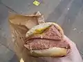 This is a list of notable sandwiches. In American English, a sandwich is understood to be a dish consisting of two or more pieces of bread with one or more fillings between them,[1][2][3] or one slice in the case of an open sandwich; however, in British English (and some other national English varieties), the definition of sandwich is narrower, requiring a sandwich to be made with bread sliced from a loaf, not other forms of bread such as rolls, buns, bagels or muffins.[4] This list article uses the American definition, so some of the sandwiches listed herein may not be considered sandwiches in other national varieties of English.