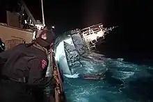 | Bing Bing | The 55-foot (17 m) fishing trawler started listing to starboard, and then capsized.[52][53] An eyewitness said it started smoking at 2:30 or 2:35 PM, before sinking around 90 seconds later one mile (1.6 km) from the shore of Humarock Beach in Massachusetts, United States. Three survivors were found clinging to a black hose, and pulled from the water at 3:10 PM. Two of the survivors were treated for hypothermia, and ingestion of diesel fuel and sea water, while a third was discharged from hospital.[54] | |