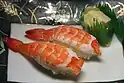 Ebinigirizushi Japan Hand-pressed sushi, consists of an oblong mound of sushi rice that the chef presses between the palms of the hands to form an oval-shaped ball, and a peeled and boiled shrimp or ebi as neta (topping) draped over the rice ball.