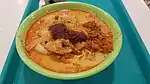 Bubur ayam[40] | Indonesia | A porridge of rice and shredded chicken, served with soy sauce, spices, fried shallots, cakwee (fried dough), krupuk (a type of cracker), and sambal (a hot sauce); often eaten for breakfast[41] |