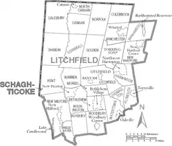 Map of Litchfield County, Connecticut showing cities, boroughs, towns, CDPs, and Indian Reservations