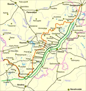 Red Army captured one town after another: Zarasai and Švenčionys (Dec. 22), Utena (Dec. 23), Rokiškis and Vilnius [33] (Jan. 5), Ukmergė and Panevėžys (Jan. 9), Šiauliai (Jan. 15), Telšiai (Jan. 25).[30] That accounted for about 2⁄3 of the Lithuanian territory. The front somewhat stabilized when Soviet forces were stopped near the Venta River by Latvian and German units (Baltische Landeswehr).[34] Also, Germans slowed down the withdrawal of their troops after the Spartacist uprising was subdued on January 12.[35] Southern Lithuania was a little better protected as Germans retreated from Ukraine through Gardinas. To prevent fights between retreating Germans and the Red Army, the Soviets and Germans signed a treaty on January 18. The treaty drew a temporary demarcation line that went through Daugai, Stakliškės, and 10 kilometres (6.2 mi) east of the Kaišiadorys–Jonava–Kėdainiai railway.[36] That barred Bolshevik forces from directly attacking Kaunas, Lithuania's second-largest city. The Red Army would need to encircle Kaunas and attack through Alytus or Kėdainiai. The operation to take Kaunas began on February 7.