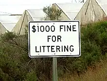 For example, in California the punishment for first-time littering starts at a minimum $250 fine and eight hours of picking up roadside litter. A defendant's third offense and all subsequent offenses are punished with a maximum penalty of a $3,000 fine and 24 hours of litter cleanup (per offense).[4] [5] Such penalties are often prominently posted on roadside signs.