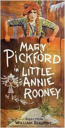 Little Annie Rooney is a 1925 American silent comedy-drama film starring Mary Pickford and directed by William Beaudine. Pickford, one of the most successful actresses of the silent era, was best known throughout her career for her iconic portrayals of penniless young girls. After generating only modest box office revenue playing adults in her previous two films, Pickford wrote and produced Little Annie Rooney to cater to silent film audiences. Though she was 33 years old, Pickford played the title role, an Irish girl living in the slums of New York City.