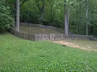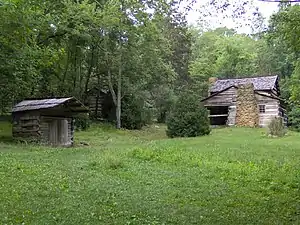 The Walker Sisters Place (sometimes referred to as the King-Walker Place after its primary builders) was the home of five spinster sisters who refused to sell their 166-acre (0.7 km2) plot to the national park and maintained their traditional mountain life into the 1950s. In 1946, the Saturday Evening Post published an article on the Walker sisters that drew a flood of tourists to the area.[6] The "kitchen" part of the cabin was built in the 1840s by early settler Brice McFalls. The larger cabin was built in the 1850s by Wiley King. His sons completed the cabin's massive chimney, and his son-in-law, John N. Walker, built the cabin's porch and merged the larger cabin with the smaller McFalls cabin.[2] By 1921, the cabin and farm had passed to five of Walker's daughters— Margaret Jane, Polly, Louisa, Hettie, and Martha— who had lived on the land their entire lives.[6] The National Park Service assumed control of the land when the last of the Walker Sisters died in 1964.[2]