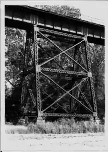 In 1872, Bollman's firm, Patapsco Bridge and Iron Works completed the bridge and viaducts with a total length of 705 feet, span over little pipe creek of 135 feet,[lower-alpha 1] trestle consisting of 19 spans, eleven on the Frederick County side and eight on the Carroll County side of the creek.[1]