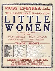 Little Women is a 1917 British silent historical drama film directed by Alexander Butler and starring Daisy Burrell, Mary Lincoln and Minna Grey. It was the first film adaptation of the 1868-69 two-volume American novel Little Women by Louisa May Alcott. It is now considered a lost film.[2]