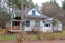 The Nashua, Acton and Boston Railroad, which ran from Concord to Nashua, ran through Westford with two stations near the eastern part of Littleton. Passenger service on the line ran from 1876 to 1924; it was abandoned entirely in 1925.[2] East Littleton station was located at Littleton Road (MA 110), about a mile east of Littleton Common.[26] It received frequent shipments of coal and grain for the Conant and Company store nearby.[3]:249 Pine Ridge station (also known as Westford) was located at Forge Village Road.[26] [2]The former station building has been converted to a private residence; the former freight house and section house are used as outbuildings.[4]:215