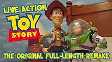 Live Action Toy Story is a 2012 comedy-adventure fan film produced by the Arizona-based Jonason Pauley and Jesse Perrotta; it is a shot-by-shot recreation of the 1995 original computer-animated film of the same name, with the toy characters animated through stop-motion or filmed moving with wires and strings.[1] As of August 30, 2023, it has nearly 49.9 million views on YouTube.