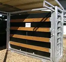 Lower side panels and/or gates of sheet metal, timber or conveyor belting are used in some cases to ensure animals' legs do not get caught and reduce the likelihood of operator injury.[4] At least one side gate is usually split to allow access to various parts of the animal being held, as well as providing access to feed a calf, amongst other things. A squeeze crush has a manual or hydraulic mechanism to squeeze the animal from the sides, immobilizing the animal while keeping bruising to a minimum. A sliding entrance gate, operated from the side of the crush, is set a few feet behind the captured animal to allow for clearance and prevent other animals entering. Crushes will, in many cases, have a single or split veterinary gate that swings behind the animal to improve operator safety, while preventing the animal from moving backwards by a horizontal rump bar inserted just behind its haunches into one of a series of slots. If this arrangement is absent, a palpation cage can be added to the crush for veterinary use when artificial insemination or pregnancy testing is being performed, or for other uses.[5] Older crushes can also be found to have a guillotine gate that is also operated from the side via rope or chain where the gate is raised up for the animal to go under upon entering the crush, and then let down behind the animal.