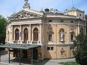 The facade of the Opera House has Ionic columns supporting a pediment with a tympanum above the entrance and has two niches at the side adorned with allegorical statues of Tragedy and Comedy by the sculptor Alojz Gangl (1859–1935).