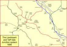The Llantrissant and Taff Vale Junction Railway was incorporated by Act of 7 June 1861; it was to acquire the Llantwit Vardre Railway; capital was set at £40,000, and the Company could arrange for the Taff Vale Railway to work its line.[4][3][6]
