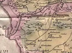 Blaeu's map of 1654 shows a settlement names "Lons"[9] In 1747 Loans is marked as such with four enclosed areas of land and dwellings with Scallachmill nearby on a road from Fullarton to Irvine.[10] By 1775 Loans is shown as a cluster of buildings on the Irvine to Ayr road with a road now also running to Dundonald.[11] By 1832 Loans is shown with a toll and two additional roads, both running towards Troon and the coast.[12] The 1857 OS Map shows a number of buildings at Sculloch Mill, Robertloan House and two toll bars and associated houses.[13] By 1897 the school and smithy are shown with a nursery with greenhouses established near the crossroads.[14]