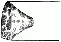 The framework of the bottom consists of three strips of wood, either hemlock, spruce, or pine (the first mentioned being the most durable), a little longer than the width of the pot, about 2¾ inches wide, and 1 inch thick. In the ends of each of the outer strips, a hole is bored to receive the ends of a small branch of pliable wood, which is bent into a regular semicircular curve. These hoops are made of branches of spruce or hemlock, or of hardwood saplings, such as maple, birch, or ash, generally retaining the bark. Three of these similar frames, straight below and curved above, constitute the framework of each pot, one to stand at each end and one in the center. The narrow strips of wood, in general, ordinary house laths of spruce or pine, which form the covering, are nailed lengthwise to them, with interspaces between about equal to the width of the lathe. On the bottom, the laths are sometimes nailed on the outside and sometimes on the inside of the cross pieces. The door is formed by three or four of the laths running the entire length near the top. The door is hinged on using small leather strips and is fastened by a single wooden button in the center, or by two buttons, one at each end. The openings into the pot ... are two in number, one at each end, are generally knit of coarse twine, and have a mesh between three-fourths of an inch and 1-inch square. They are funnel-shaped, with one side shorter than the other, and at the larger end have the same diameter as the framework. The smaller inner end measures about 6 inches in diameter and is held open using a wire ring or wooden hoop. The funnels are fastened by the larger ends to the end frames of the pot, with the shorter side uppermost, so that when they are in place they lead obliquely upward into the pot instead of horizontally. The inner ends are secured in position by one or two cords extending to the center frame. The funnels are about 11 or 12 inches deep and therefore extend about halfway to the center of the pot. They taper rapidly and form a strongly inclined plane, up which the lobsters must climb in their search for the bait. A two-strand manila twine is most commonly used for the funnels. Cotton is also used, but is more expensive and less durable.