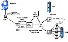 Modern implementations may include a digital loop carrier system segment or fiber optic transmission system. The local loop may terminate at a circuit switch owned by a competitive local exchange carrier and housed in a point of presence (POP), which typically is an incumbent local exchange carrier telephone exchange. A local loop supports voice and/or data communications applications in the following ways:
